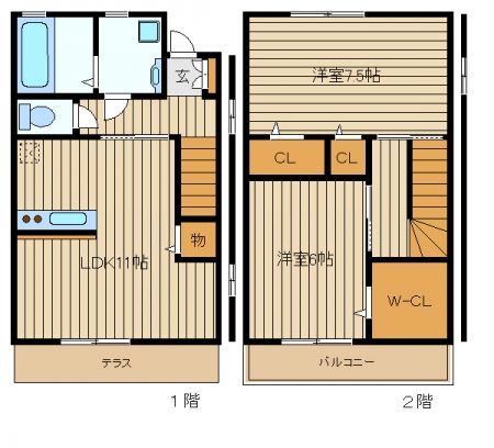 | 築年月 | 2010年6月 | 間取り | 2LDK( 洋室7.5畳(2階)/洋室6畳(2階)/LDK11畳(1階) ) | 専有面積 | 65.99m2 |