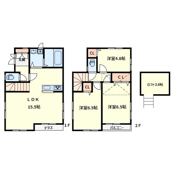 | 築年月 | 2019年10月 | 間取り | 3LDK( 洋室4.8畳(2階)/洋室6.5畳(2階)/洋室6.5畳(2階)/LDK15.5畳(1階) ) | 専有面積 | 77.42m2 |